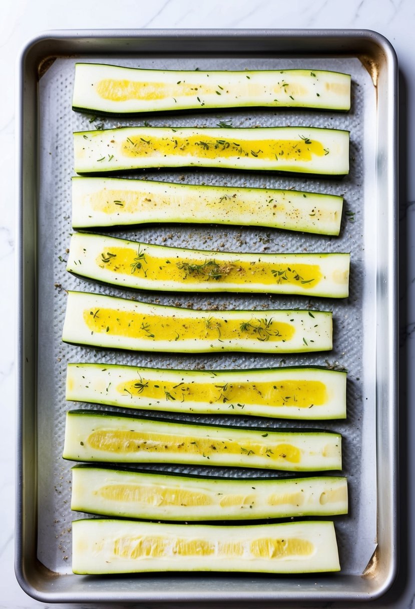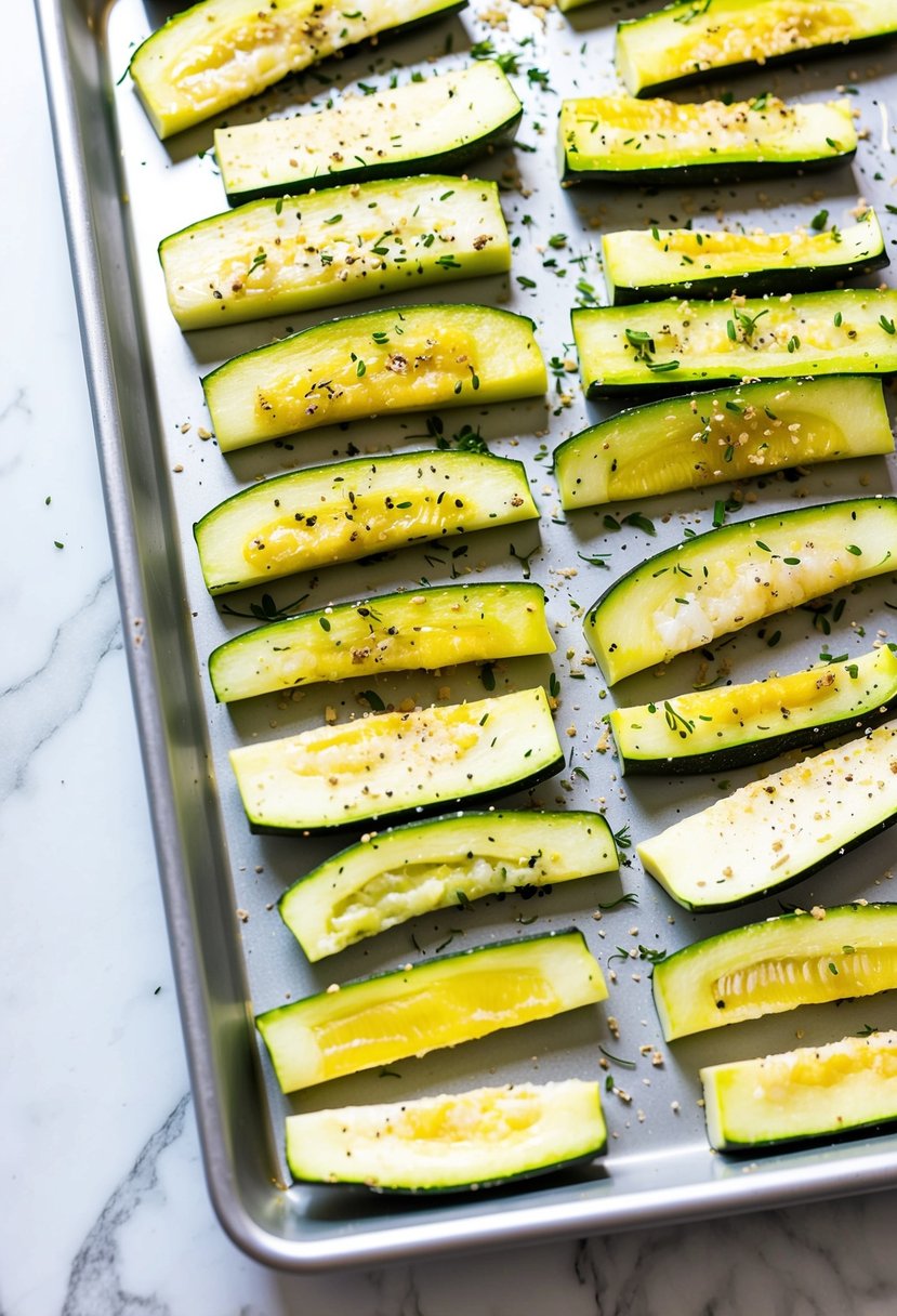 Start by slicing your zucchini into thick slabs. Drizzle olive oil over them and sprinkle with your favorite herbs. Garlic powder, oregano, and thyme work well together.