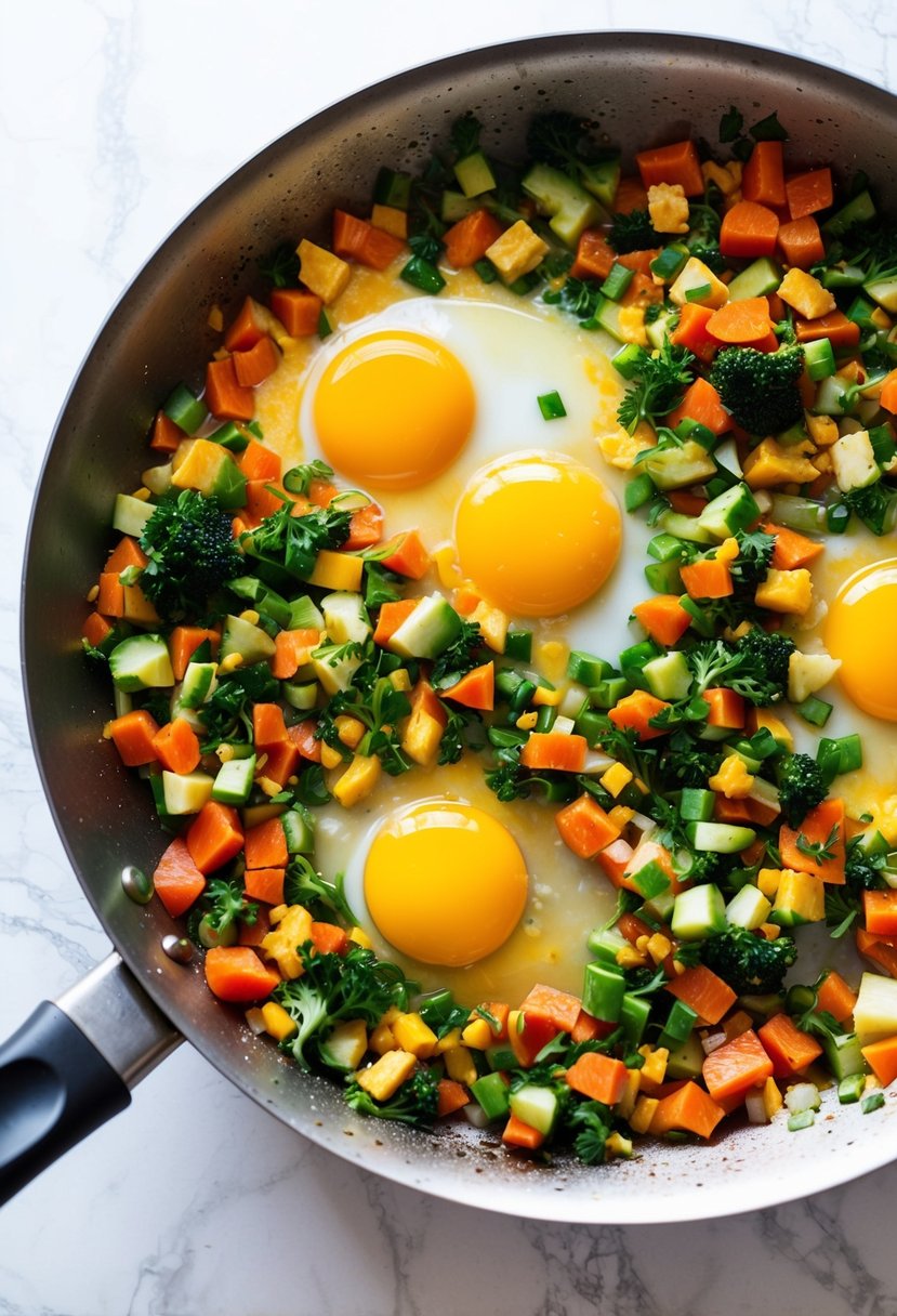 Start by sautéing your leftover vegetables in a pan with a little oil. Then, beat some eggs and pour them over the veggies. Cook on low heat until the edges set, then finish it in the oven at 350°F (175°C) until fully cooked.