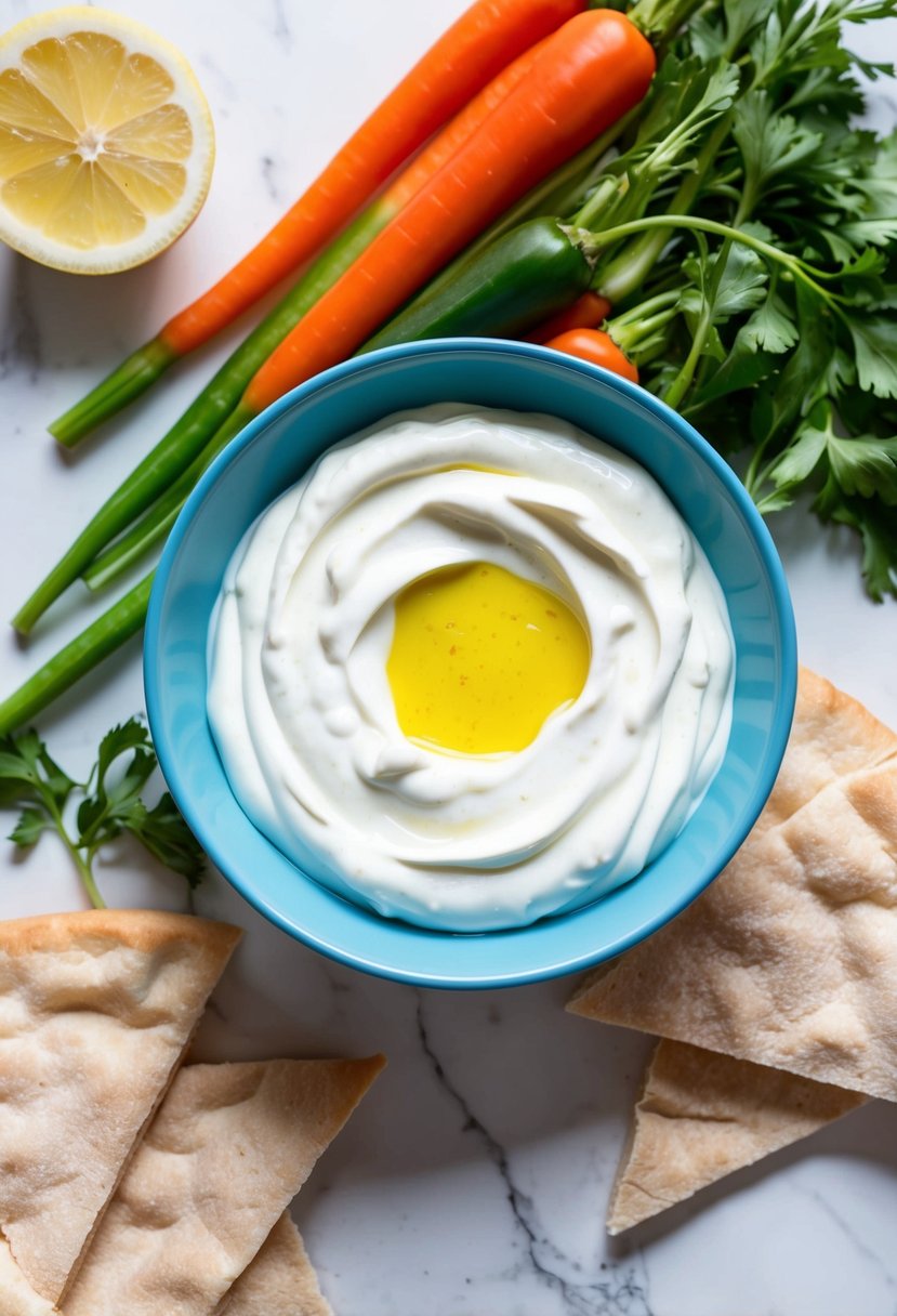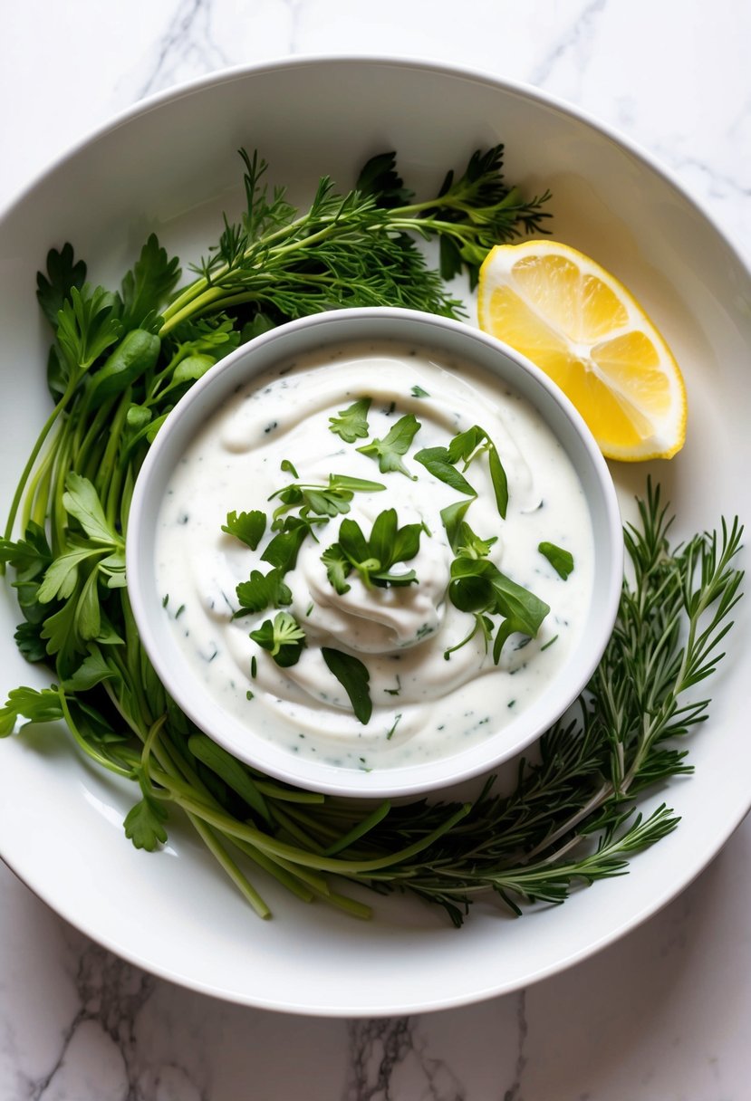 To prepare, you will need plain Greek yogurt, fresh lemon juice, olive oil, and herbs like basil. This combination creates a creamy texture with a zesty kick.