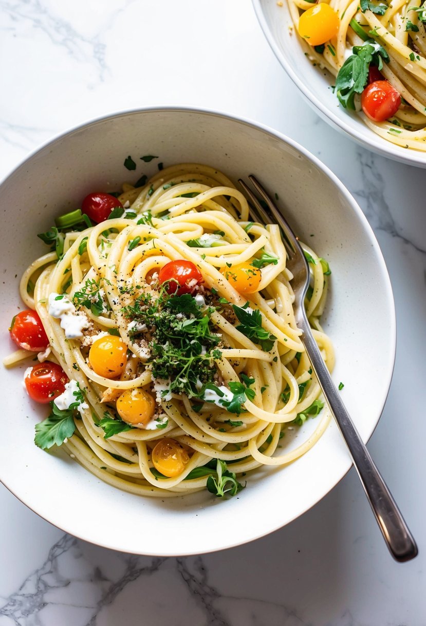 Start by cooking your favorite pasta according to package instructions. While it cooks, prepare a sauce with Greek yogurt, garlic, lemon juice, and a touch of olive oil.