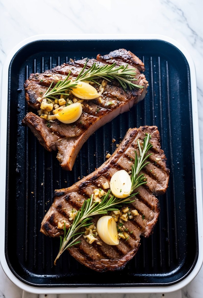 Next, prepare a mix of herbs like rosemary, thyme, and parsley, along with garlic powder. Rub this mixture on your steaks, then let them sit for about 30 minutes.