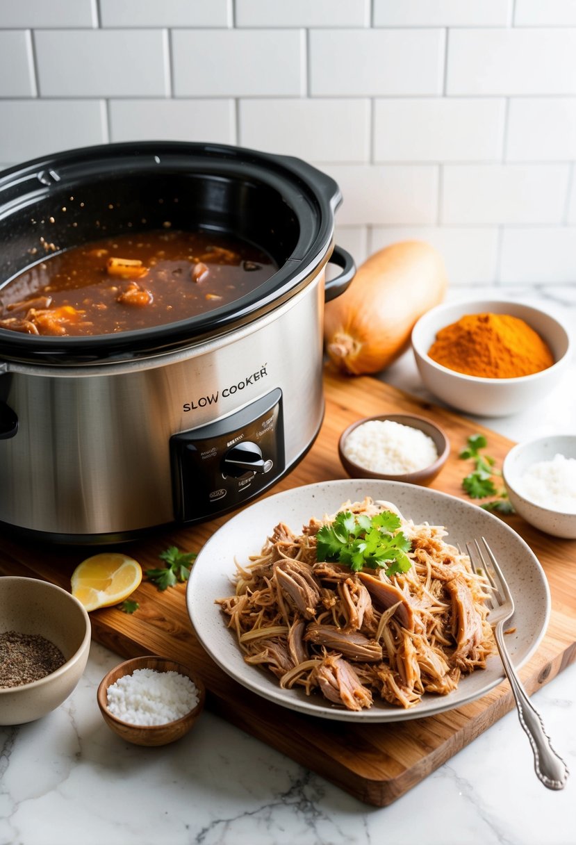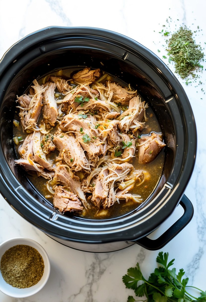 Cook the pork on low for about 8 hours (around 93 degrees Celsius) or high for about 4 hours (around 149 degrees Celsius). Once done, shred the pork with a fork, and it’s ready to serve.