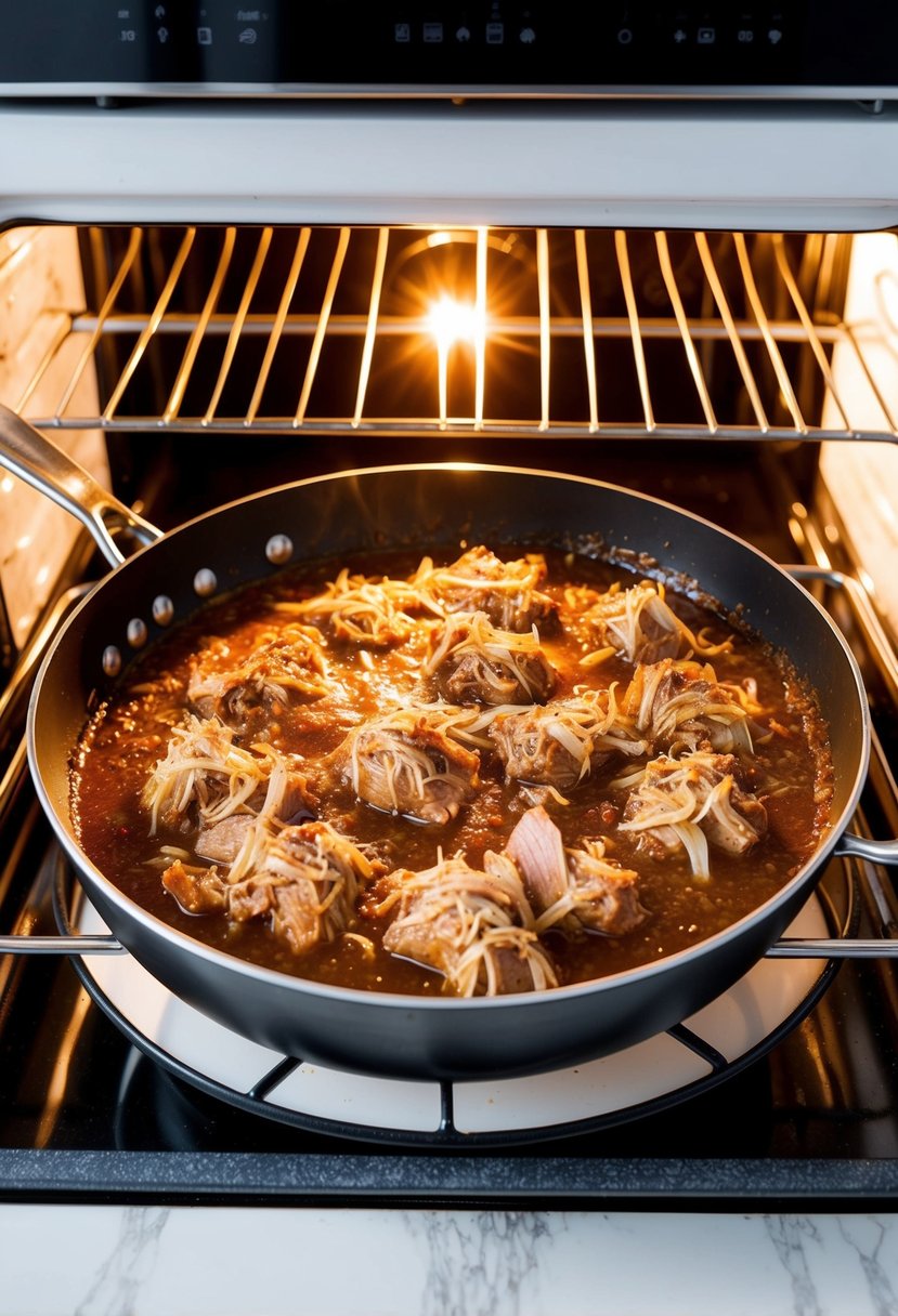 Cover the pot and let it cook in the oven at 300°F (150°C) for about 3 to 4 hours.