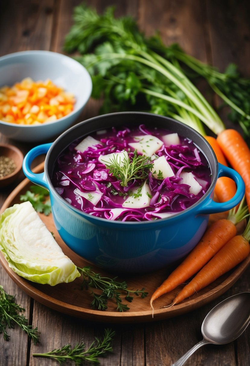 This soup is a comforting mix of red and white cabbage. It’s perfect for a chilly day. The flavors blend beautifully to create a warm dish that’s filling and tasty.