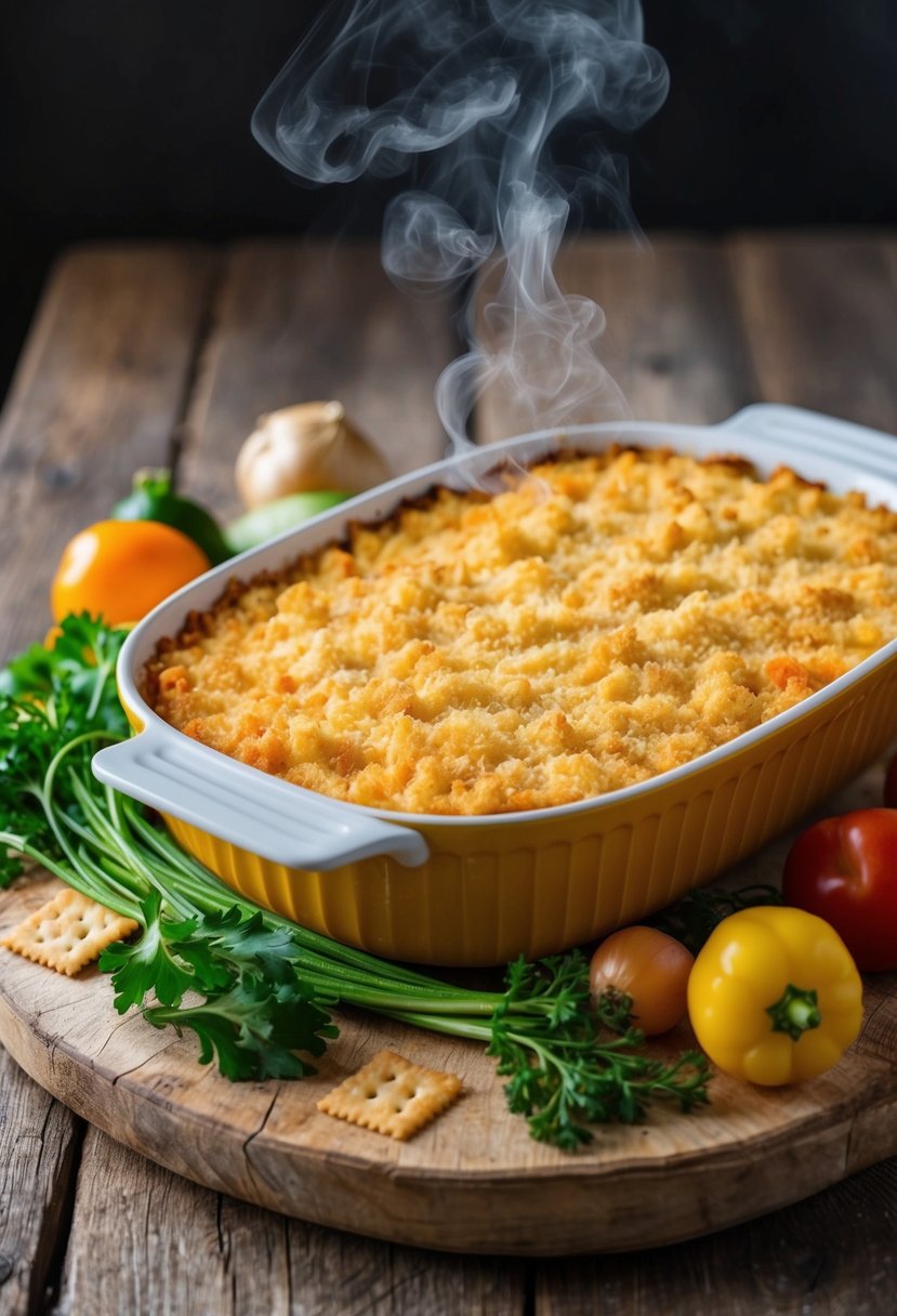 Next, you’ll make the topping by mixing crushed buttery crackers with melted butter. Spread this mixture over the vegetables. Bake in a preheated oven at 350°F (175°C) until the cheese is bubbly and the topping is golden.
